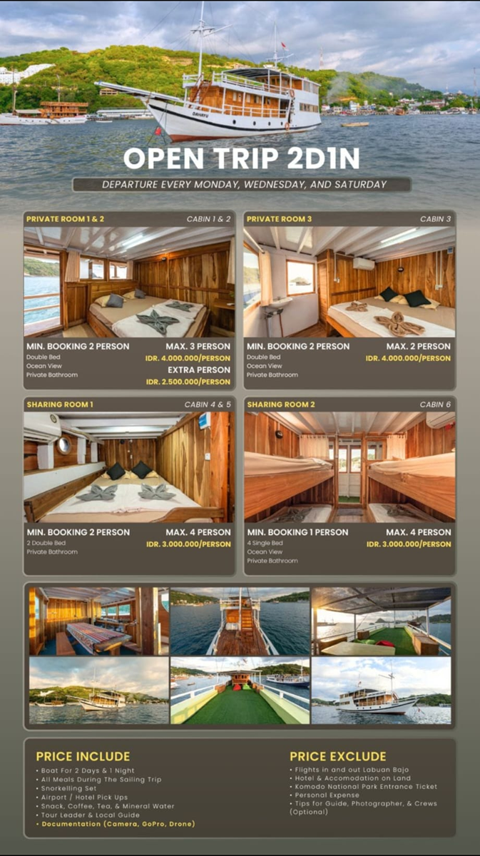 Photo boat Komodo 2 Days Trip Photo Boat Komodo Komodo 2 Days and 1 Night, Start from Labuan Bajo Standard Boat Private Cabin Sharing Cabin Luxury Boat Komodo 2 days Luxury Boat